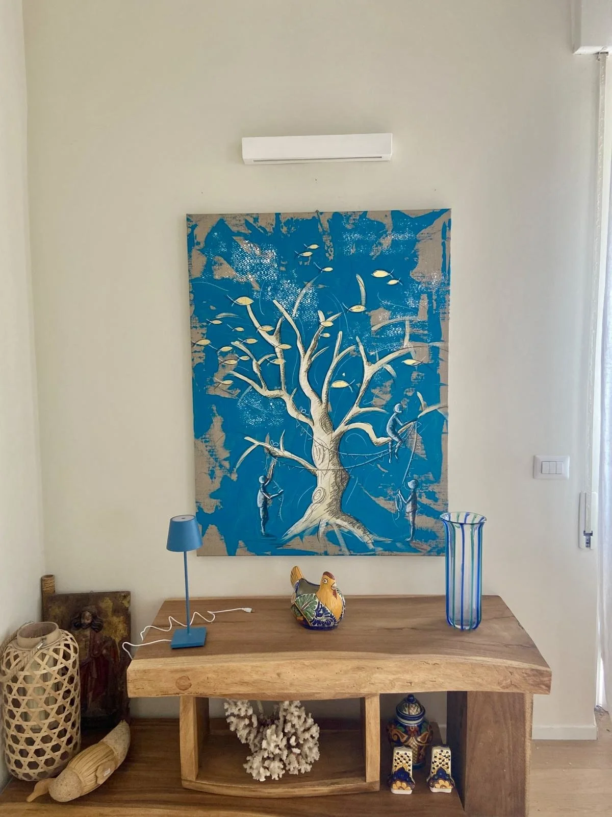 Dopo aver lavorato per molti anni in agenzie di comunicazione fra Milano e Genova, prima come creativa, poi come account e new business manager, ho deciso di dedicarmi unicamente ai miei quadri e al mio omino, soggetto della mia arte.